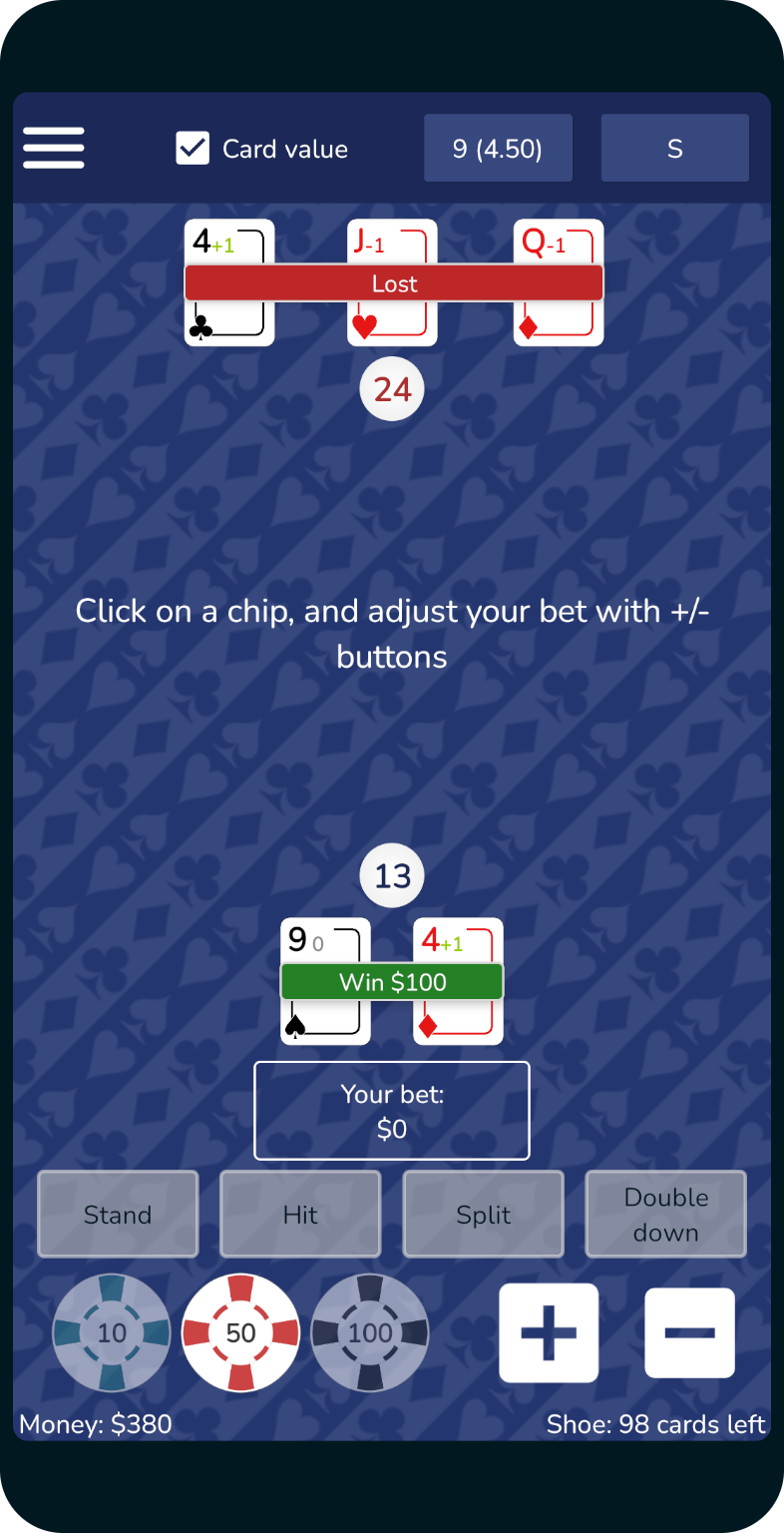 - Make in-game decisions based on the basic strategy and the calculated true count. When the true count increases, try to place higher bets. Keep your bets low if the count decreases and the current deck is not in your favor.