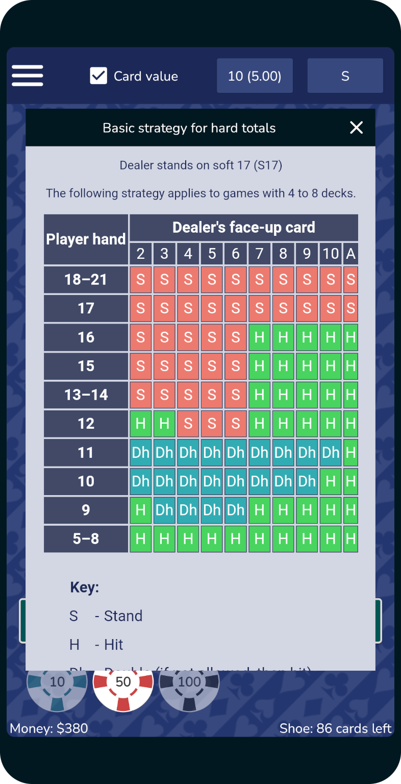 Blackjack is a game that can be influenced by the right amount of knowledge and skills. The basic strategy is a set of rules that indicates the optimal (mathematically correct) way of playing any hand against any dealer up-card so that in the long-run the house advantage (the expected loss of the player) is minimized. In order to make the most of every deal, you need to determine your probability of winning or going bust in a particular situation. The basic strategy can vary slightly depending on the casino rules.