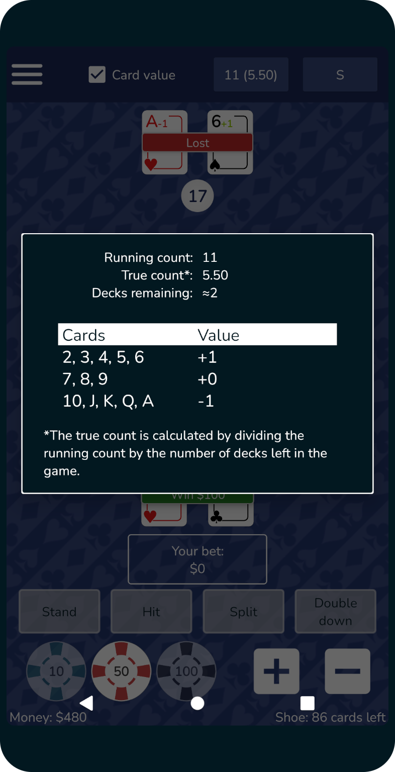 - Calculate a true count by dividing the running count by the number of decks left in the shoe.