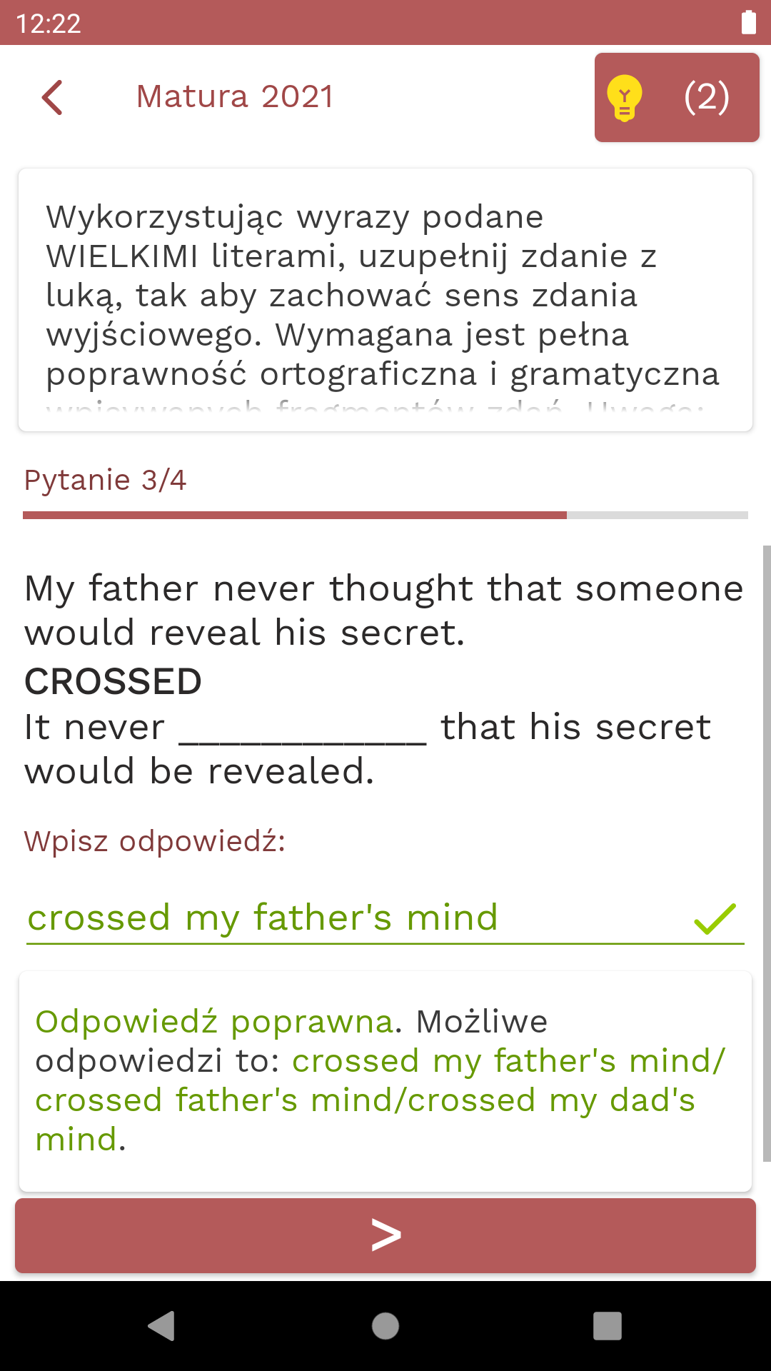 Aplikacja Matura z angielskiego przechowuje Twój postęp w rozwiązywaniu zadań maturalnych, dzięki czemu masz kontrolę nad stopniem przygotowania do egzaminu. Zaglądaj do aplikacji regularnie i poprawiaj swoje rezultaty.
